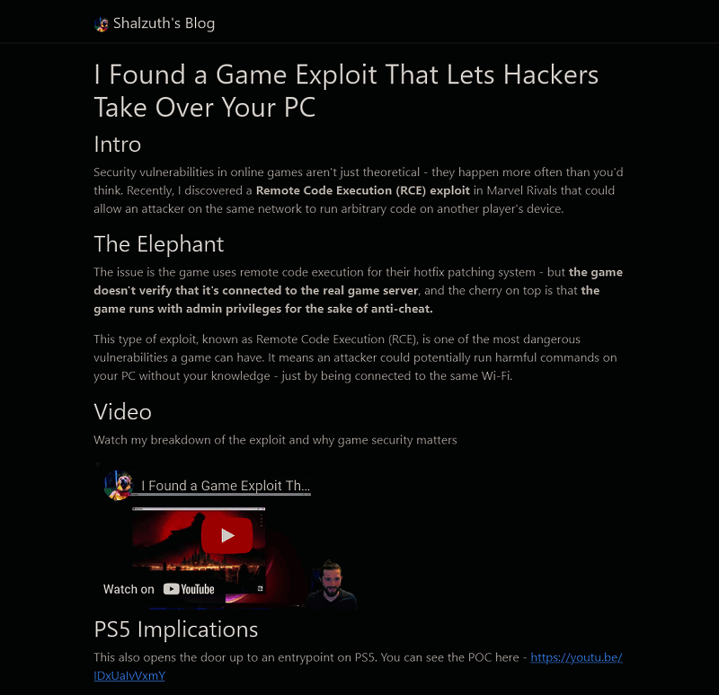 据称,该漏洞可以让黑客访问玩家的 PC 和 PS5。在报告中,开发人员使用了“远程代码执行热修修补系统”,但是当代码被执行时,“游戏不会验证”命令是否来自于真实的服务器。此外,由于游戏的反作弊需要管理员权限,该漏洞属于管理员权限下,导致黑客能够更加轻易的接管设备。