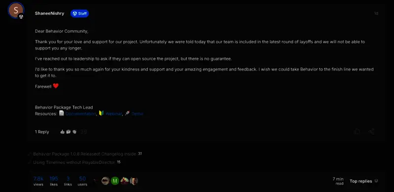Nishry 在帖子里确认整个项目的所有人都受到最新一轮的裁员影响,因此该项目的支持将即刻停止。她写道:“感谢各位对我们项目的热爱和支持。不幸的是,我们今天被告知,我们的团队看也被包含在最新一轮裁员中,我们将无法再为各位提供支持。我们已经联系了领导层,询问是否可以开源该项目,但不能保证。”