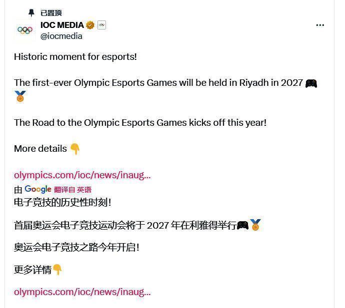 据国际奥委会官推IOC Media,首届电子竞技运动会将于2027年在沙特首都利雅得举办,首届电竞奥运会之路将在今年开启。