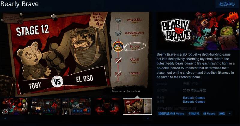 《Bearly Brave》是一款2D Roguelike卡牌构筑游戏,背景设定在一个看似迷人的玩具店中。每当夜幕降临,最可爱的泰迪熊们便会活过来,参加一场无限制的锦标赛,这场战斗将决定它们在货架上的位置——进而决定它们是否会被选中,带回家中成为永远的伙伴。