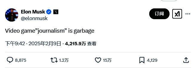 一向反对游戏woke、DEI化的马斯克近日发推,这次将矛头对准了国外的游戏媒体行业。他在X上痛斥了国外的游戏媒体行业,说:“电子游戏媒体就是垃圾(Video game”journalism” is garbage)。”