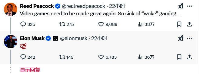 X上浏览量最多的一条回复是“电子游戏需要再次伟大。对woke游戏实在受够了。”马斯克直接回复了一个“满分100”的表情,表示非常认可、赞同这条回复。