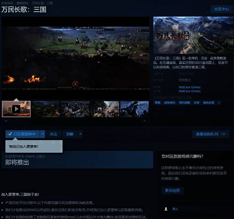 据Steam页面显示,《万民长歌:三国》是一款单机策略游戏,仅支持单人模式,游戏具体发售日期尚未公布。付费模式方面,此前官方表示将采用一次性买断制单机付费模式。制作团队明确宣称该游戏“纯PC,纯单机”的态度,也传达出网易勇闯无人区,培养单机类别新用户的决心。