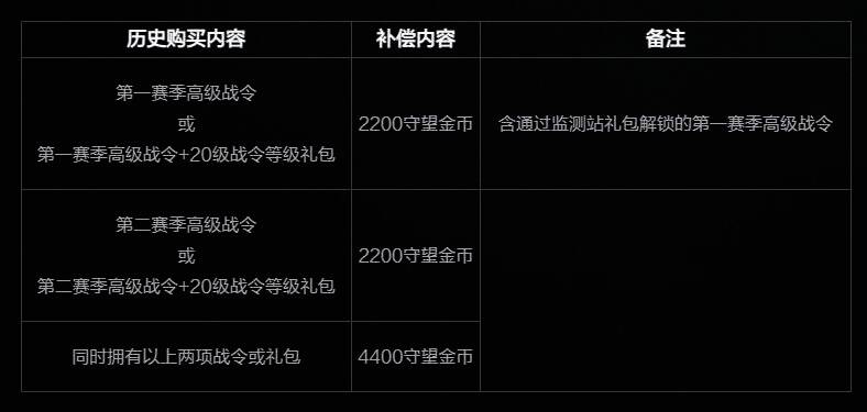 2月10日,暴雪公布了《守望先锋》国服第一赛季和第二赛季高级战令补偿,在《守望先锋》关服前购买过第一赛季或第二赛季高级战令的玩家,无论战令等级,每个赛季高级战令补偿2200守望金币,同时拥有以上两个赛季战令的玩家可以获得4400守望金币。