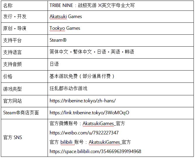 Akatsuki Games Inc.(本社:东京都品川区,代表董事兼CEO:戸冢佑贵,为日本Akatsuki Inc.全资子公司)与Too kyo Games (本社:埼玉县所泽市、代表董事兼CEO:小高和刚)共同打造的“TRIBE NINE”企划,其正在开发中的同名游戏“TRIBE NINE:战极死游”(以下简称 “战极死游”)于 2 月 8 日的官方节目中正式宣佈,游戏将于 2025 年 2月 20 日全球上市。