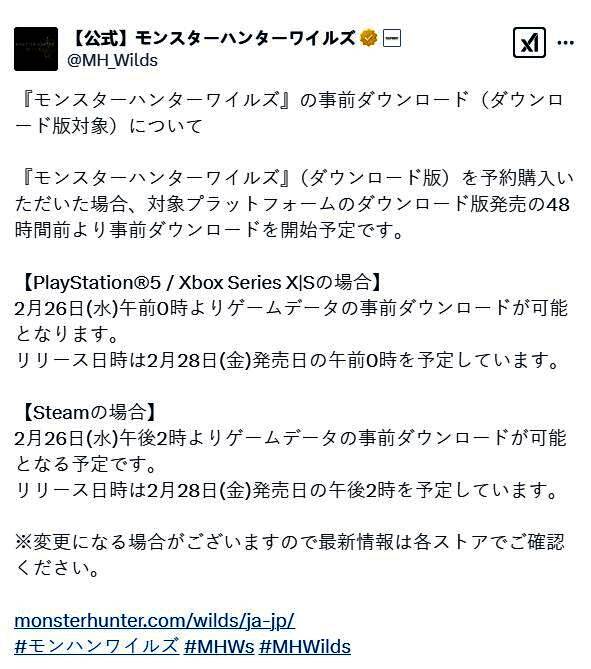 卡普空公布了《怪物猎人:荒野》全平台详细预加载时间和游戏解锁时间,该作的预加载将在游戏发生前48小时开启,而主机版的正式解锁时间要比Steam早11个小时,具体安排如下。