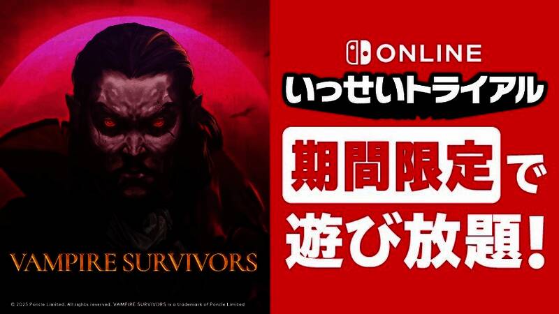 2月10日,任天堂宣布将为Switch Online日服会员举行新试玩活动,本次要试玩的游戏是《吸血鬼幸存者》,预计将于2月17日11:00开启,一直持续到2月24日16:59。