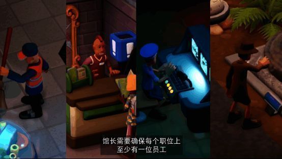 为了维持馆内的正常运转,你需要聘用不同的员工。专家负责寻找和研究文物,以及展品的日常维护。清洁工打扫馆内的卫生,提供舒适的环境,顺便在工作间制作东西。助理负责售票处和纪念品商店的经营,忙里偷闲协助下文物寻找。保安除了保证展品的安全之外,还要收集游客老爷们慷慨的捐款。