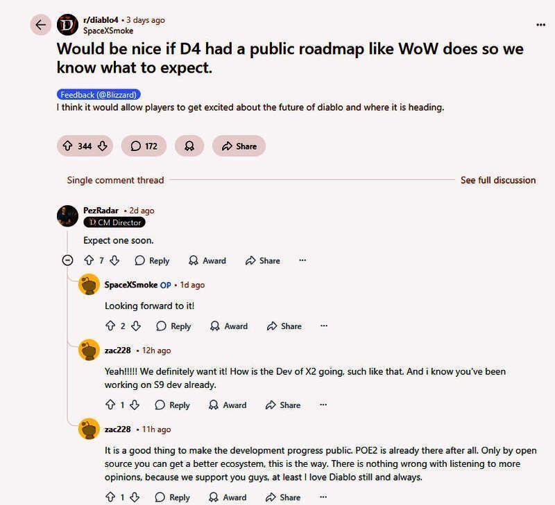 两天前,在Reddit上,一名网友希望暴雪《暗黑》开发团队也能像《魔兽》那样有自己的内容更新路线图,这样就能知道可以期待什么了。对此暴雪社区经理Adam Fletcher表示:“很快就会有”。