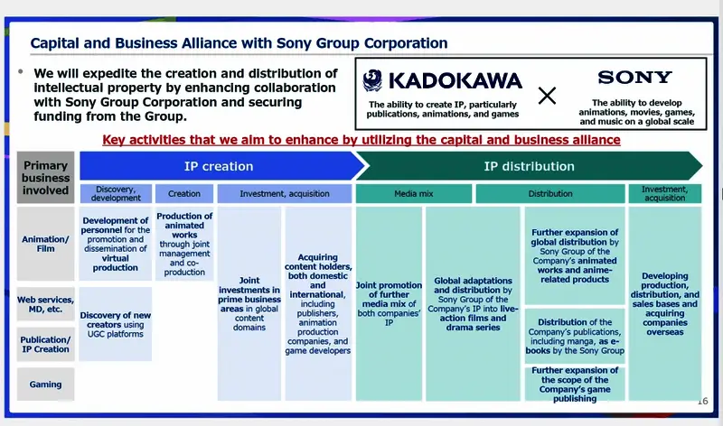 近日,角川公布了其最新业绩报告,其中有一部分概述了他们与索尼的合作关系,索尼在2024年12月与角川签订了协议,收购了角川500亿日元的股票,成为了角川的最大股东。