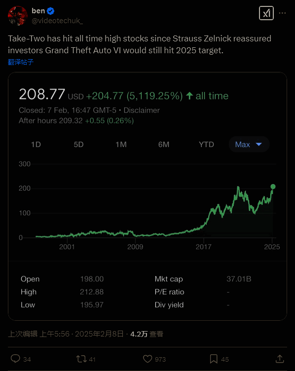 Take-Two Interactive Software 股票每股开盘价格为 198 美元,最高达到了近 213 美元,收盘价为 208.77 美元。