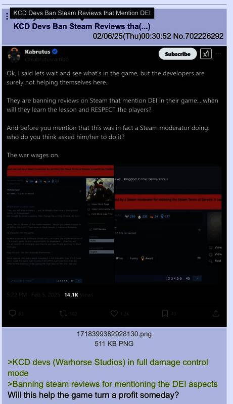 现在《天国:拯救2》禁止大家在Steam上讨论DEI。游戏博主Pirat_Nation发推文称,一些玩家发布的DEI评论会被立即删除,虽然那些评论看起来没有违反任何规则。