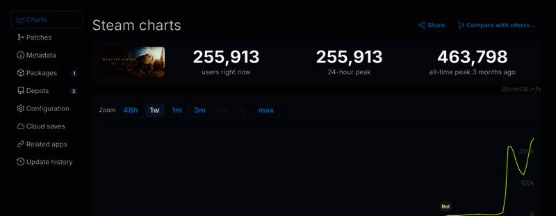 根据SteamDB数据,《怪物猎人:荒野》第二次BETA公测当前同时在线25.5万人,仍在继续增长中,第一次BETA公测的峰值为46.3万人。