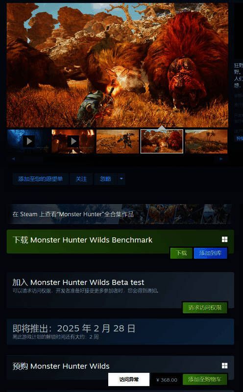 《怪物猎人:荒野》即将于2月28日正式发售,距离发售还有20天时间,Steam国区标准版368元,豪华版478元,高级豪华版578元。