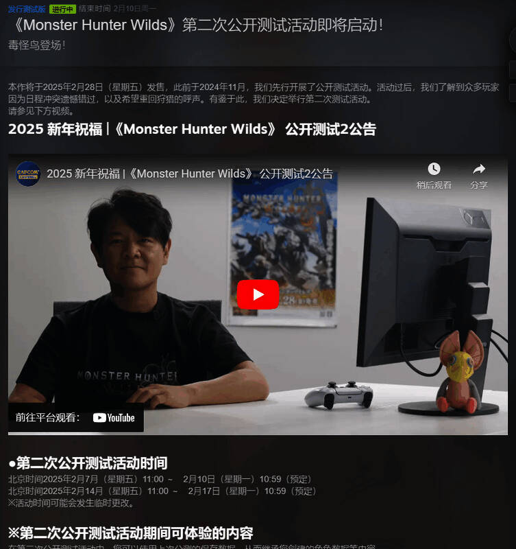《怪物猎人:荒野》第二次BETA公测现已在今天(2月7日)上午11点上线,持续到2月10日上午11点。下轮测试将在2月14日上午11点开启,持续到2月17日上午11点。