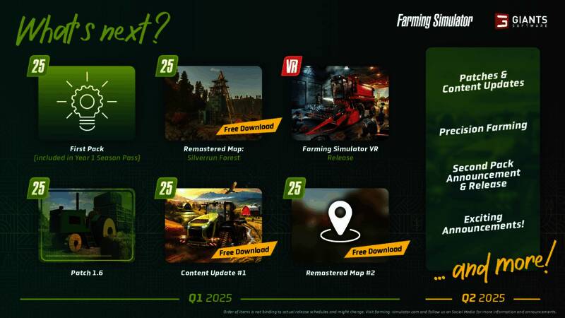 与销量公告一同发布的还有《模拟农场25》的未来开发更新路线图,该作的首个DLC将于2024年第一季度发售,同时游戏将添加额外的免费内容,包括1.6补丁、两个重制的地图以及其他内容等,而在2025年第二季度,游戏还会实装“精准农业”系统以及更多内容。