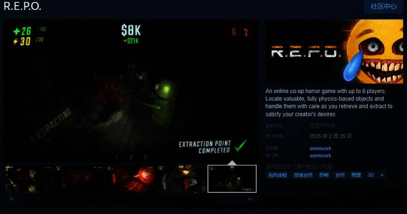 今日(2月7日),合作恐怖游戏《R.E.P.O.》Steam页面开放,2025年2月26日发售,暂不支持中文,感兴趣的玩家可以点击此处进入商店页面。