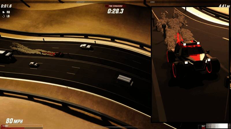 SpeedDemons 2 为您提供独特的动作视角,这要归功于它的追逐摄像机视角。通过 3 个摄像机角度(垂直向下、高角度追逐和低角度追逐),您将从不同的角度进行比赛。由于这种相当独特的视角——以及大量的附加效果——游戏的速度感特别强烈。为了使动作更直观,控制重点在于移动,而不是转向。您将拥有油门、刹车和涡轮增压(或能力)按钮,并且您可以上下移动模拟摇杆(或鼠标)来控制车辆的方向。