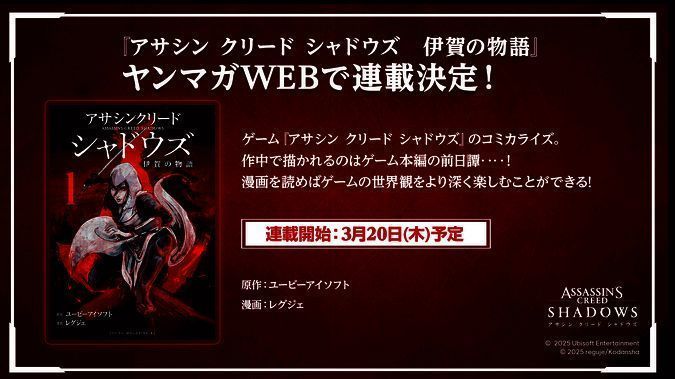 育碧旗下系列最新大作《刺客信条:影》即将于3月20日发售,登陆PS5、XSX/S和PC平台。日前官方宣布将推出衍生漫画《伊贺物语》确定网络发布连载,聚焦本作的前传故事。