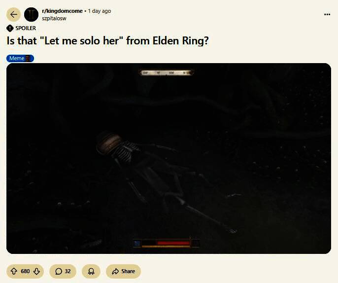 随着游戏的推出,有玩家在游戏中发现了一处致敬彩蛋,那就是在游戏中有着一具独特的骷髅,除了裤子身上并无其他衣物,其头部还被一个大大的陶壶所覆盖,让不人不免联想到《艾尔登法环》知名玩家“壶头哥(Let Me Solo Her)”的经典造型。