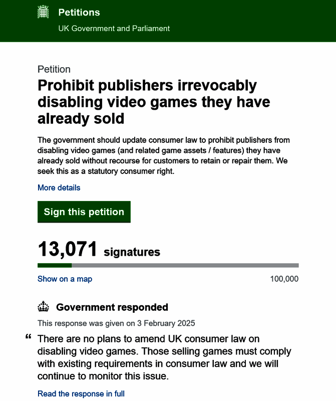 部门的生命写道:“我们知道存在有关于数字内容声明周期相关的问题,包括电子游戏,并理解部分玩家对于某些游戏的担忧。但是,英国法律内并没有关于软件公司必须支持它们老版本产品的硬性需求……在某些情况下,公司可能会根据维护用户数量下降的游戏的旧服务器的运行成本过高决定(停止支持)。”