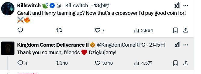这一推文获得了超过100万的查看,这一波免费宣传确实起到了强大的引流作用。不少《巫师》粉丝看到后可能会选择购买《天国:拯救2》,甚至在评论区有玩家希望二者能联动:杰洛特和亨利组队杀怪?