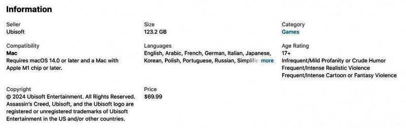 最近有玩家发现苹果商店列出了《刺客信条:影》Mac版容量大小——123GB。官方称会充分利用Apple芯片强大威力,为Mac带来高帧率、高分辨率体验。支持光线追踪,有更绚丽的视觉效果。