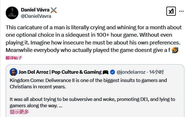强悍作风的Daniel Vavra再次下场,回应了这名玩家:“这个人为了100多小时游戏中一个支线任务的可选选项,哭哭啼啼真的是抱怨了一个月。甚至连游戏都没有玩过。想像一下他对自己的喜好有多没安全感。与此同时,每个真正玩过游戏的人都不屑一顾。”
