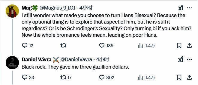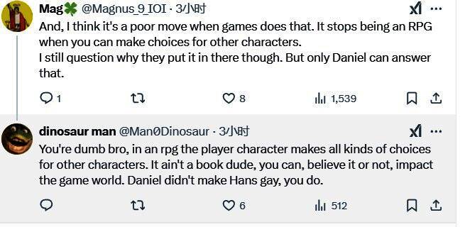 不过,还是有玩家继续追问,为什么续作把男主亨利变成了双性恋,“现在整个兄弟情都感觉很卑鄙无耻,汉斯也受到了影响”。