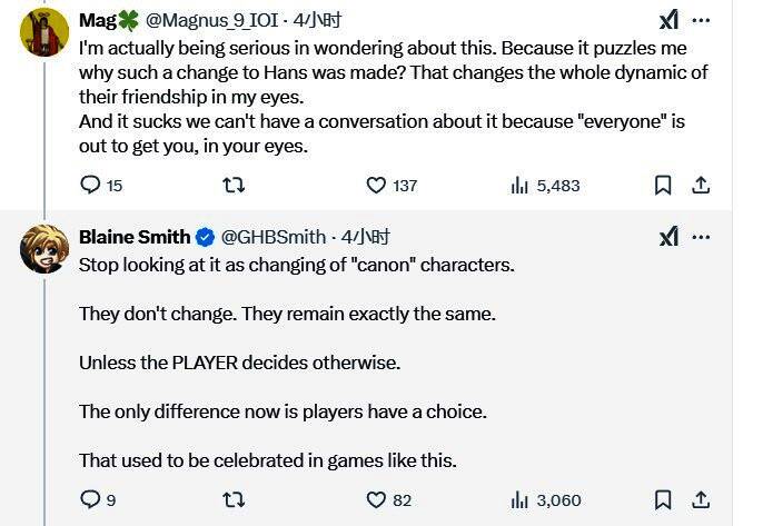 不过有玩家替Daniel给出了答案:“亨利和汉斯都没变,他们在游戏中还是一个样。是玩家现在有了选择,是玩家的选择导致了这一变化。”