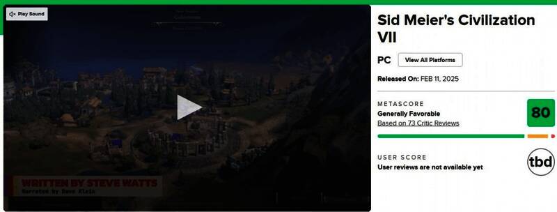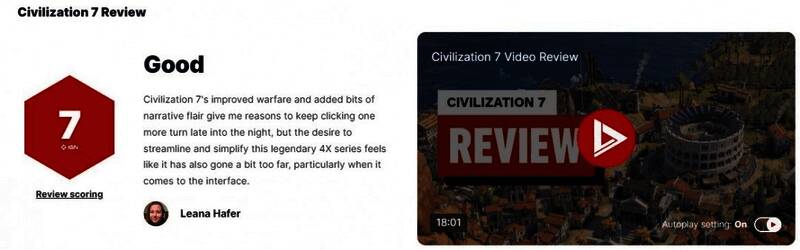 GameSpot、Wccftech、VG247也给80分,GameSpot指出《文明7》的“再来一回合”元素依旧,游戏过程能享受大量不同的玩法,新的“遗产路线和叙事事件”提供了丰富且有意义的升级途径,让玩家在历史长河中不断前进。