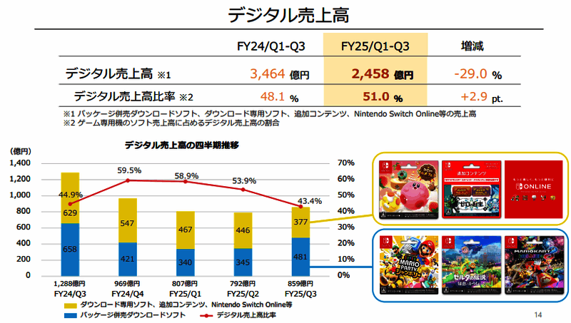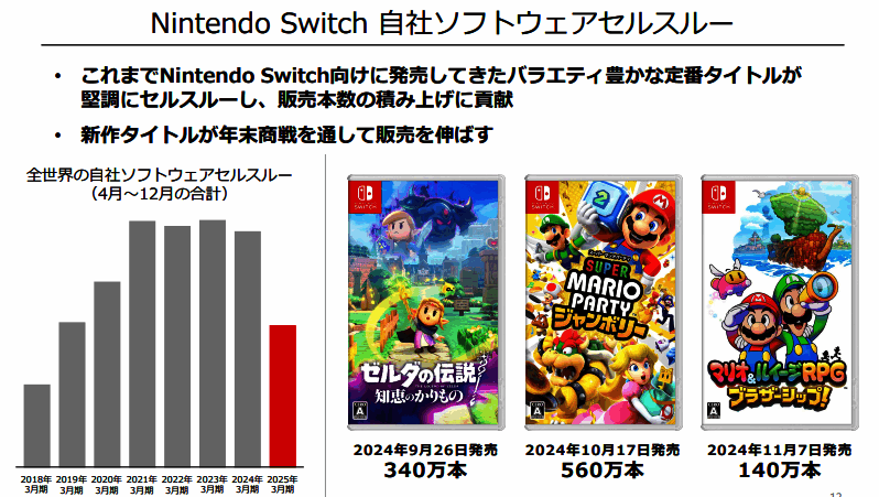 2月4日今天,任天堂公布了2025年第三季度新财报,经营收益较去年同期锐减,总销售收入9562亿日元,较去年同期锐减31.4%,营业利润2475亿锐减46.7%,业绩预期也相应下调。