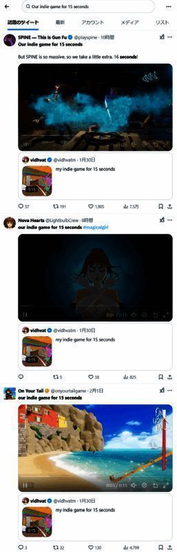 ·在X上找新游戏演示?近期玩家需要关注Our indie game for 15 seconds这个关键句就可以了,大量的新游戏开发者们纷纷跟风这个关键句展示自己的作品,反而成了一套特别玩法。