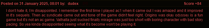 当然,这款游戏本身极具争议性,因此提前泄露的艺术集也自然引发了“绅士”们的争论。目前艺术集的评价褒贬不一,一些绅士表示就算游戏本身有问题艺术也还是优秀的,但另外一些则很不满意,一位日本绅士甚至表示他视游戏和上传艺术集的行为是对日本文化的一种侮辱。大多数对游戏的批评迎来的都是点踩,只有一位高赞评论表示,自己并不“恨”这部游戏,只是对于它感到非常失望,因为《刺客信条》系列曾经的辉煌似乎在《黑旗》之后已经一去不复返了,《影》似乎也将会是如此。