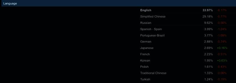而在语言方面,英文用户重新回到第一,占比33.97%,其次是简体中文用户,占比29.18%