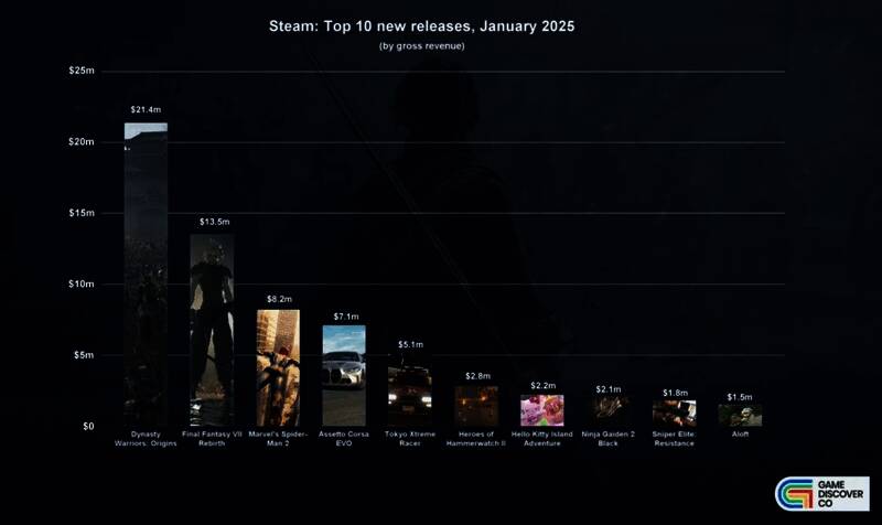 Game Discover Co发布了2025年1月Steam十大最赚钱的新发售游戏,1月17日发售的《真三国无双:起源》凭借2140万美元收入霸气登顶相当于1.55亿元,《最终幻想7:重生》和《漫威蜘蛛侠2》位列二三名,收入为1350万美元和820万美元(5946万元)。