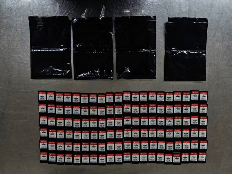 经检查,在当事人胸部文胸内发现用黑色胶纸包裹缠绕的游戏卡4包,其中各有Switch游戏卡30张。共计120张NS版《EA SPORTS FC 25》卡带。