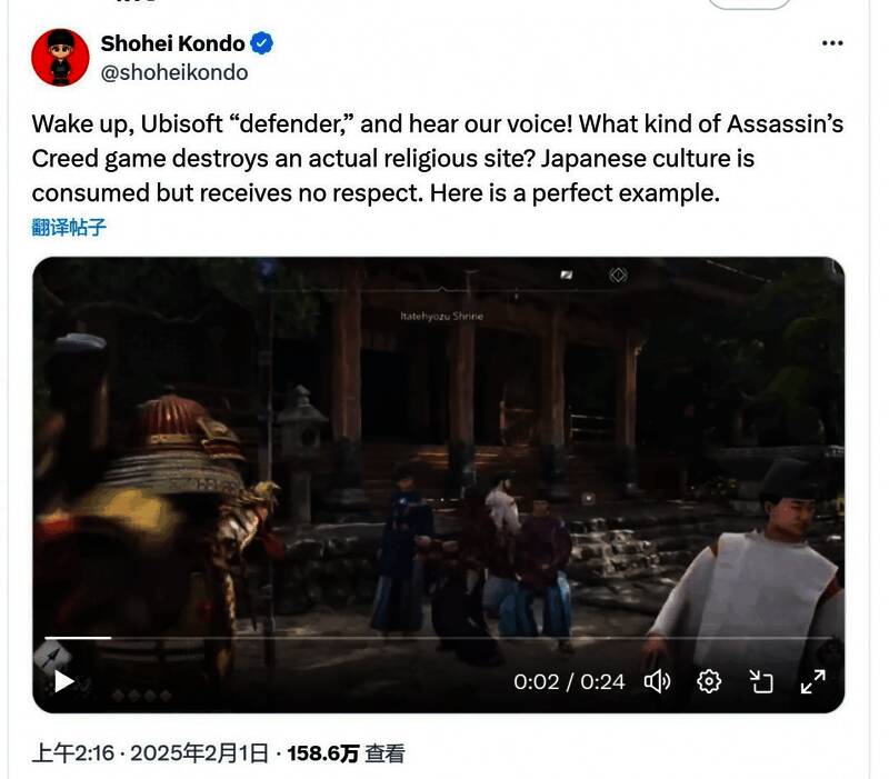 此外,推主shoheikondo发布推文,引用了一个片段,称《刺客信条:影》好不尊重日本文化,可以让主角肆意践踏宗教场所。离谱的是,引用的视频中,NPC被弥助射中头部后,竟然只是流点血,没有死,还好像没有任何事情一样逃跑了……