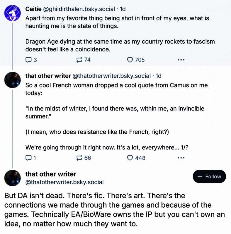 但《龙腾世纪》并没有死。有同人小说。有艺术作品。有我们通过游戏、因为游戏而建立的联系。从技术上讲,EA/BioWare拥有IP,但你无法拥有一个想法,无论他们多么想要拥有它。