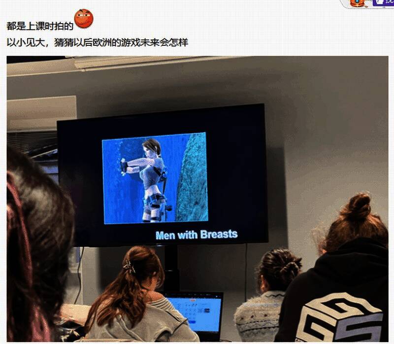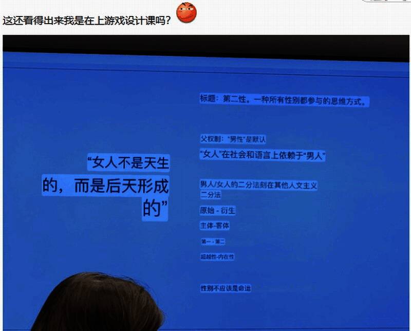 “神户小德”在贴吧发帖,展示了自己所在学校的游戏设计硕士课程的部分课件。课件中提到如何设计一个非男非女的格斗游戏角色,“女人不是天生的,而是后天形成的”、以及酷儿等内容。某些课程内容的重点还放在“性别认知”上,老师针对“玩家门事件”发表评论。