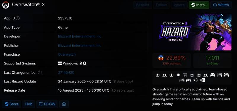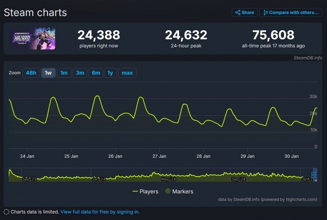 据SteamDB数据显示,从2024年9月至11月,《守望先锋2》平均玩家数在3.5万至3.2万人之间。然而《漫威争锋》于2024年12月5日推出以来,《守望先锋2》玩家数大幅下降,12月的平均玩家数降至2.5万人,下降幅度达21.7%。进入2025年1月,这一数字进一步降至1.97万人,再次下降21.8%。