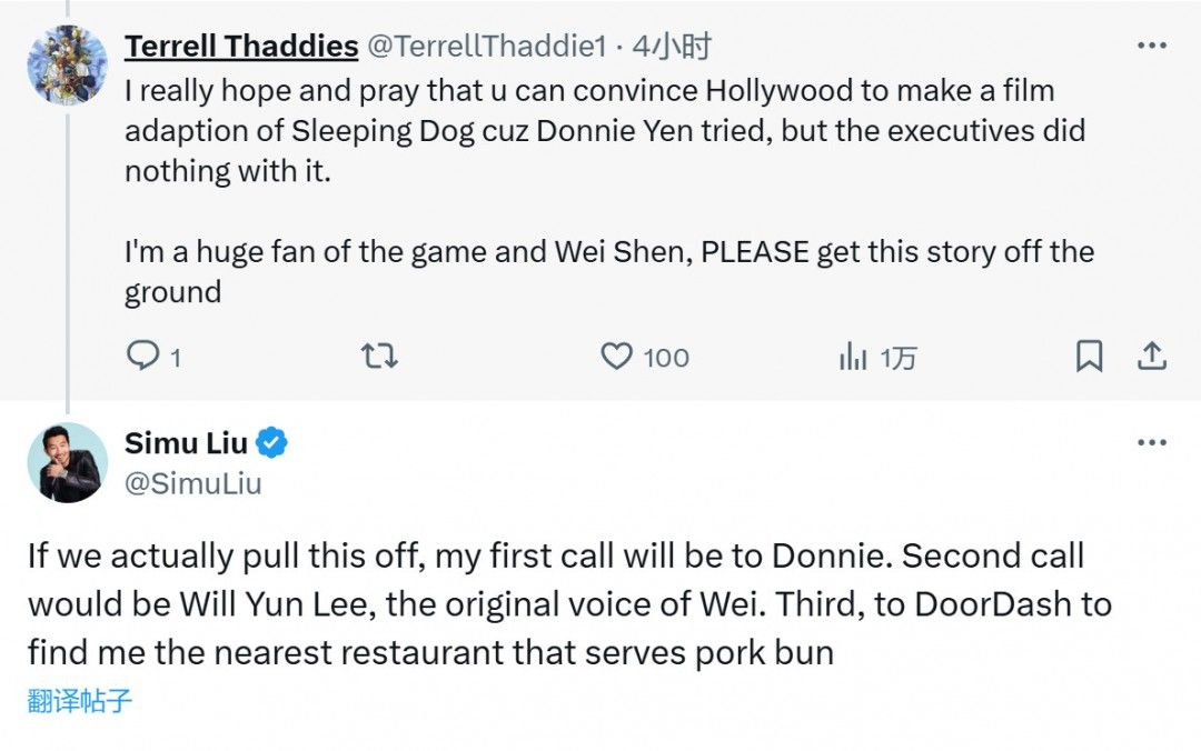 对此,刘思幕回复说:“如果真的实现了,我的第一个电话会打给甄子丹。第二个电话会打给Wei Shen的原声配音Will Yun Lee。第三个电话是给DoorDash ,帮我找一家卖猪肉叉烧包的最近餐厅。”