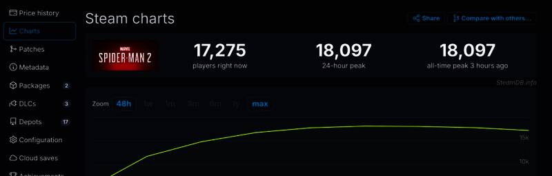 根据SteamDB,《漫威蜘蛛侠2》同时在线峰值为18097人,当前在线17275人。考虑到该作刚刚首发没几个小时,已有接近2万的在线,说明《漫威蜘蛛侠2》还是有蛮高的人气的。