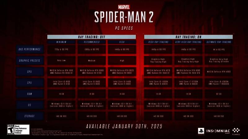 《漫威蜘蛛侠2》PC版将于1月31日发售。近日索尼公布了该作PC配置需求,并详细介绍了其光线追踪功能,一起来看看吧!