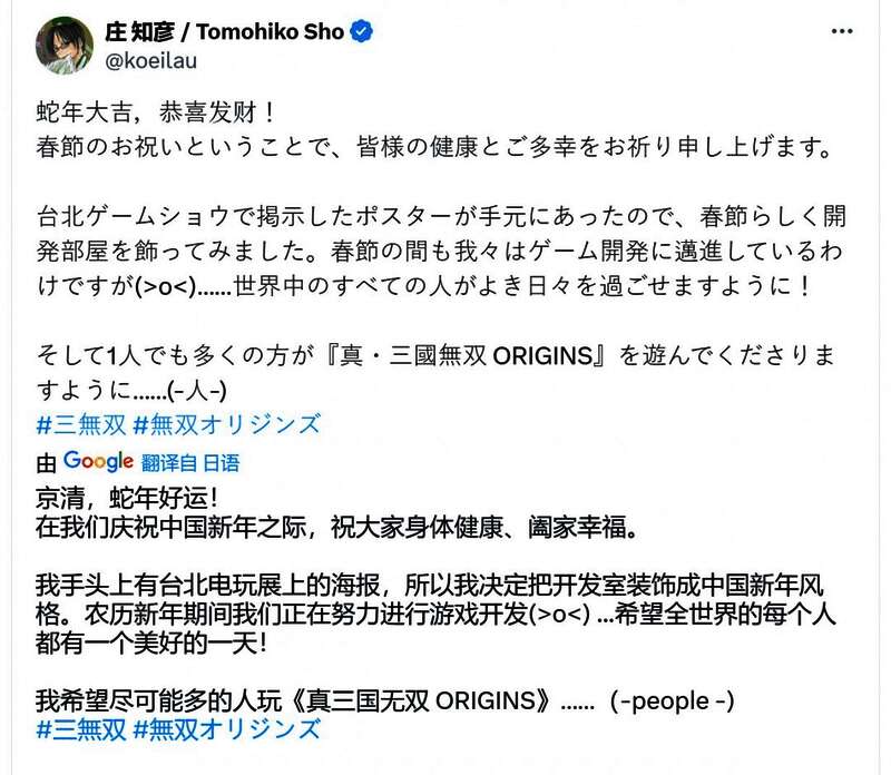 大年初一,《真三国无双:起源》制作人庄知彦在X上发推,用中文“蛇年大吉,恭喜发财!”向中国玩家拜年,发布新年祝福。