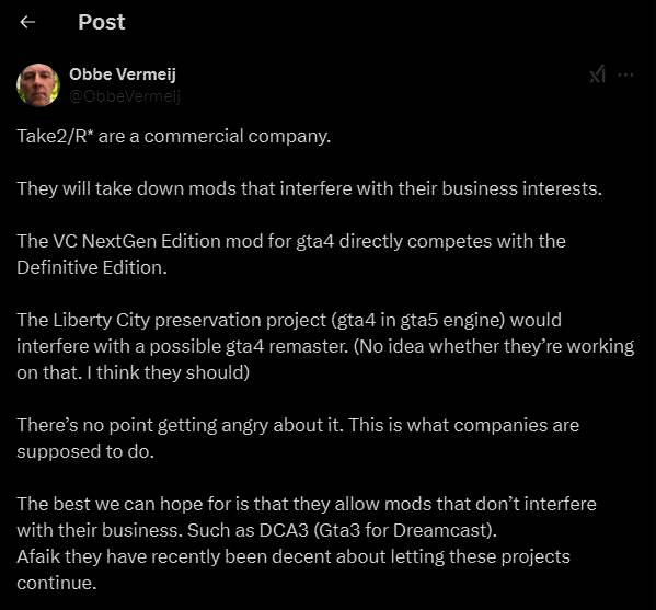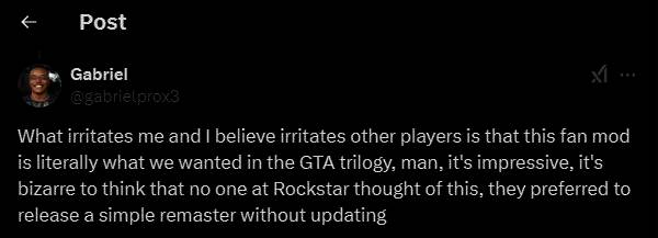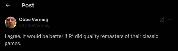 随后有玩家在Vermeij推文下表达不满,认为被官方禁止的MOD正是许多玩家想在《GTA三部曲》这样的重制版游戏中看到的效果,但R星却没能遂了玩家的愿。对此Vermeij自然表示同意,他也表示:“如果R星能对其经典游戏进行高质量的重制,那就更好了。”