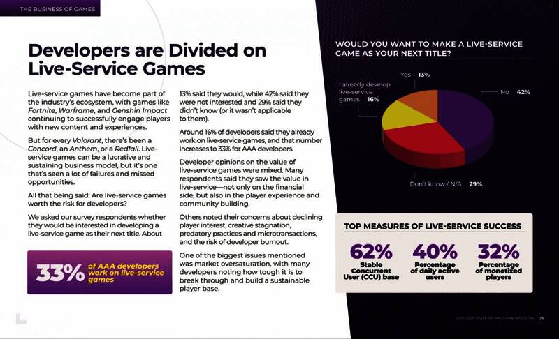 近年来实时服务型游戏(Live Service Games)屡被提及。尤其是《星鸣特攻》惨败后,许多人认为该类型游戏热潮会逐渐消退。然而有调查报告指出,服务型游戏仍是许多开发者的重点。