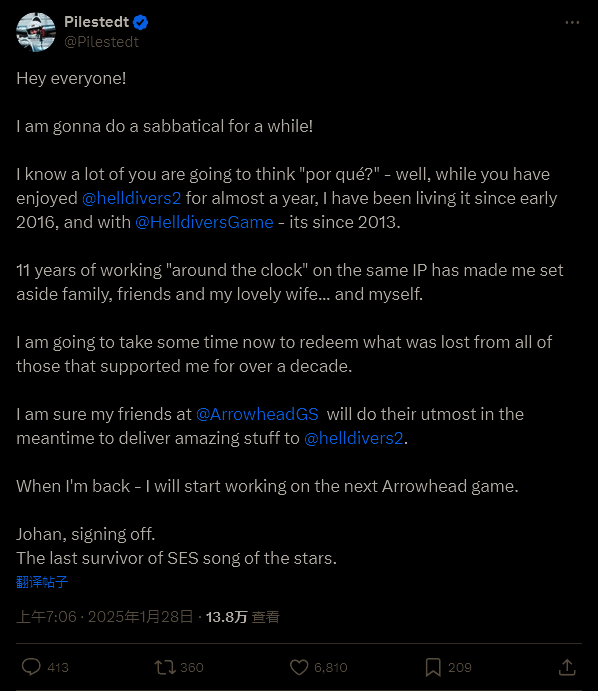 他在社交媒体推特(X)上写道:“我知道你们中的很多人会想‘por qué’(西班牙语的为什么,指玩家可能会很吃惊)。好吧,虽然你们享受《绝地潜兵2》才不到一年,它从2016 年初就是我生活的一部分,而《绝地潜兵》系列则是从 2013 年起就是如此。”