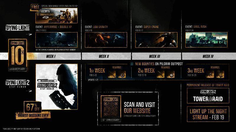 为庆祝 10 周年,《消逝的光芒2》将获得史低折扣。同时,仍然在游玩初代游戏的人将获得免费皮肤捆绑包,并且游戏内还将推出特殊的“hypermode”活动。两款游戏在之后都会推出更多的游戏内活动,包括新的和回归特殊模式。