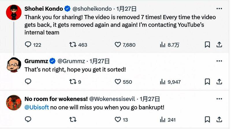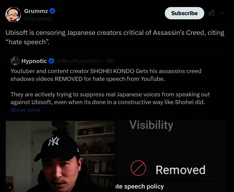 在X上,推主Grummz发推表示,育碧以“仇恨言论”为由,要求油管移除这名日本创作者批评《刺客信条:影》的视频。